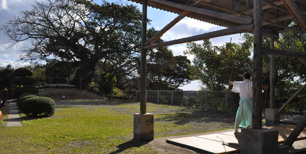 神事の後、弓で的を射るのを見学。