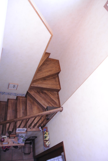 階段の曲がる所で壁と床につっかえて