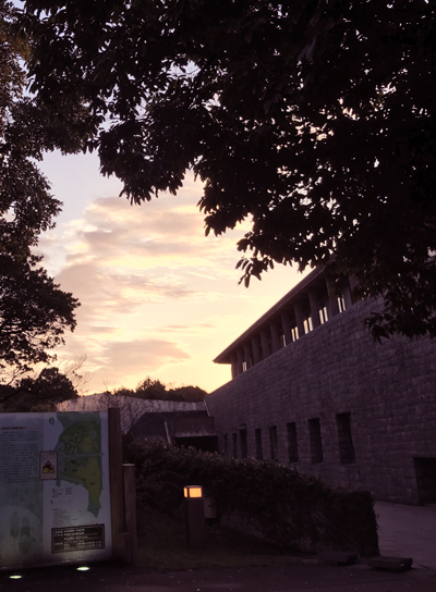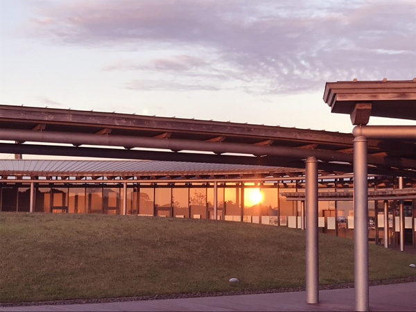建物の窓にも反射してダブル夕日。
