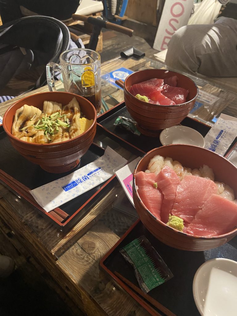 いとこのご主人と3人でマグロ丼、穴子丼、えびトロ丼を3人でシェアーして食べました。